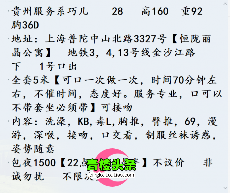 节后之前约过的妹子普遍涨价,囊中羞涩,没钱泄火,跟朋友问了一下推过来这个妹子,联系后告知可以500全套 ...