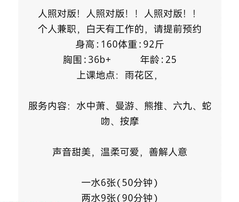 年纪问起来说是37,但是感觉应该40出头了,胸小,可以玩三通和轻度SM,玩SM的话是9张90分钟或者1800包夜, ...