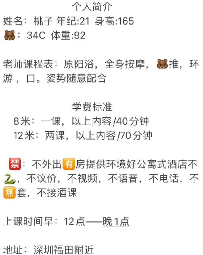 位置是在福田,地铁口走八分钟。环境地方是公寓式,浴室小。整体干净卫生。足165高,不是胖妞,身材苗条。 ...