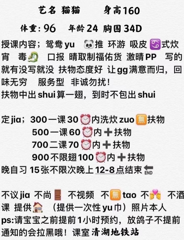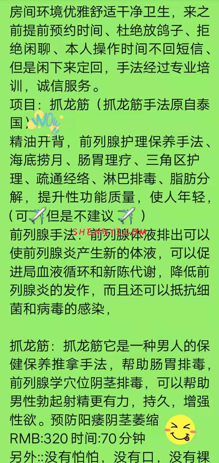服务项目比较少,不过可以自己沟通,什么磨棒,胸交都可以,自己调教去。去之前微信提前通知,接着遥控上楼 ...