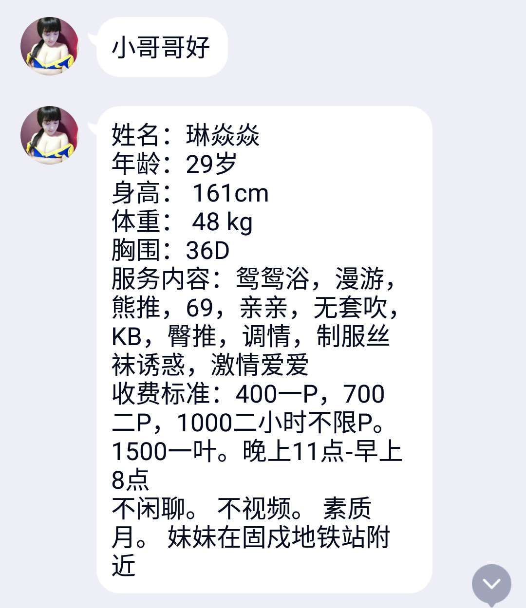 这个妹子可以,在大芬地铁站附近,昨天约的,上个月加的,因为月底来了大姨妈,所以本月初才开客,服务态度 ...