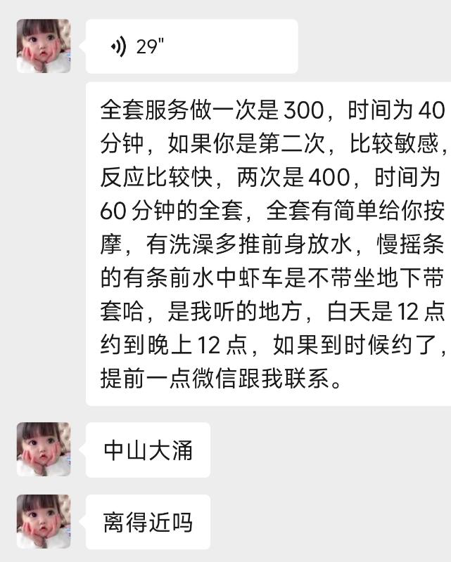小榄大信附近,服务很好,性格开放,态度好,很热情,到了进去,就帮忙洗好澡! ...