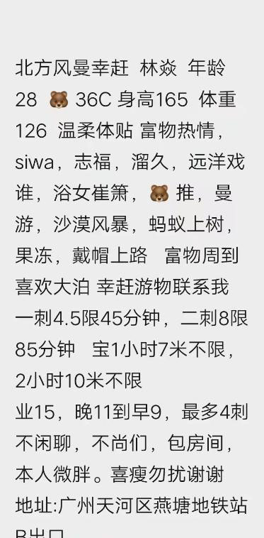 在天河体育西,地方好找,上下也方便,环境至少干净卫生。是成熟大姐姐一枚。皮肤白皙,身材翘臀,高160, ...