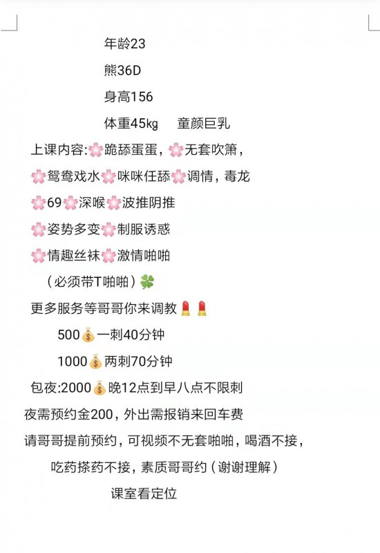 加她看到照片挺不错的,又离得不远就约课。去到看到真人颜值可以,服务不错的,口活很好,听指挥。这种身高 ...