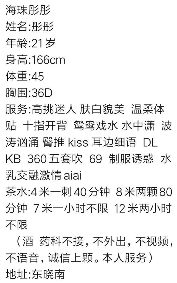 是朋友给我推荐的,身材不错,本人和照片差距不大,我给8分吧。细腰小腿细,脸蛋长的挺招人喜欢的那种。圆 ...