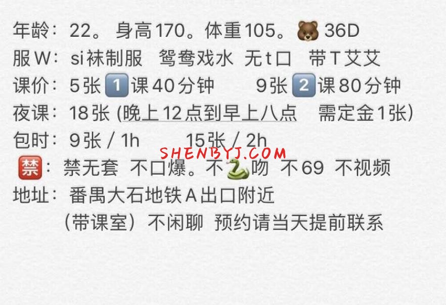 位置是在番禺,出地铁口走八分钟左右到。环境小公寓,浴室小一些。整体干净卫生。目测足170高,不是胖妞, ...
