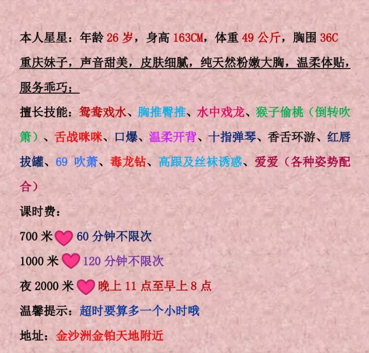 地方是小区公寓,很容易找,服务很多,课表上写的鸳鸯浴、按摩、波推、环游世界、拔罐、独龙钻、倒吹萧、69 ...